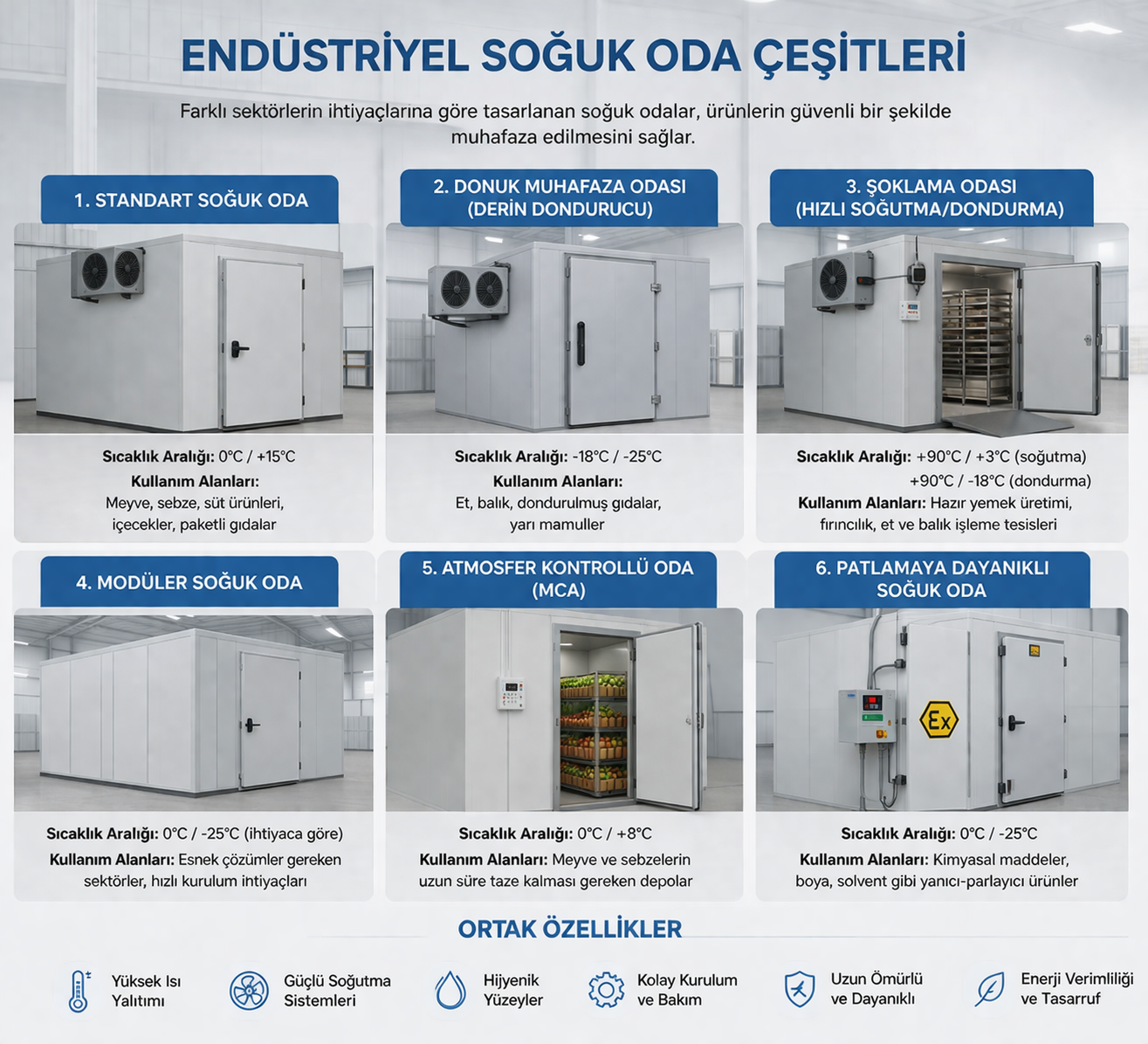 İşletmeler faaliyet gösterdikleri alana göre değişik ısı seviyelerine ihtiyaç duyar. Tarım şirketleri, meyve ve sebzeleri hasat mevsiminden sonra taze tutmayı hedefler. Et ve süt ürünleri işleyen devasa tesisler, bakteri üremesini durduran eksi dereceli depolar kurar. Sağlık kuruluşları ve laboratuvarlar, aşı gibi hassas sıvıları sabit derecelerde koruma altına alır. Lojistik firmaları, uzun taşıma zincirinin her halkasında tır içindeki derecenin sabit kalmasını diler. Bütün bu iş kolları, malların ömrünü uzatan dayanıklı tesis yatırımlarından yararlanır. İşletme sahipleri, kendi üretim prosedürlerine tam uyan bir soğuk hava deposu sistemi inşa eder.