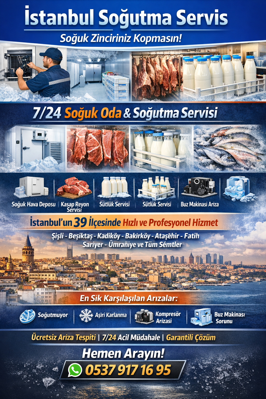 İster Maslak soğuk oda servisi, ister Silivri sogutma servisi, ister Ümraniye soğuk hava deposu arıza olsun, tek numara ile çözüm: 0537 917 16 95 WhatsApp’tan arıza videosu atın, ön teşhis yapalım.