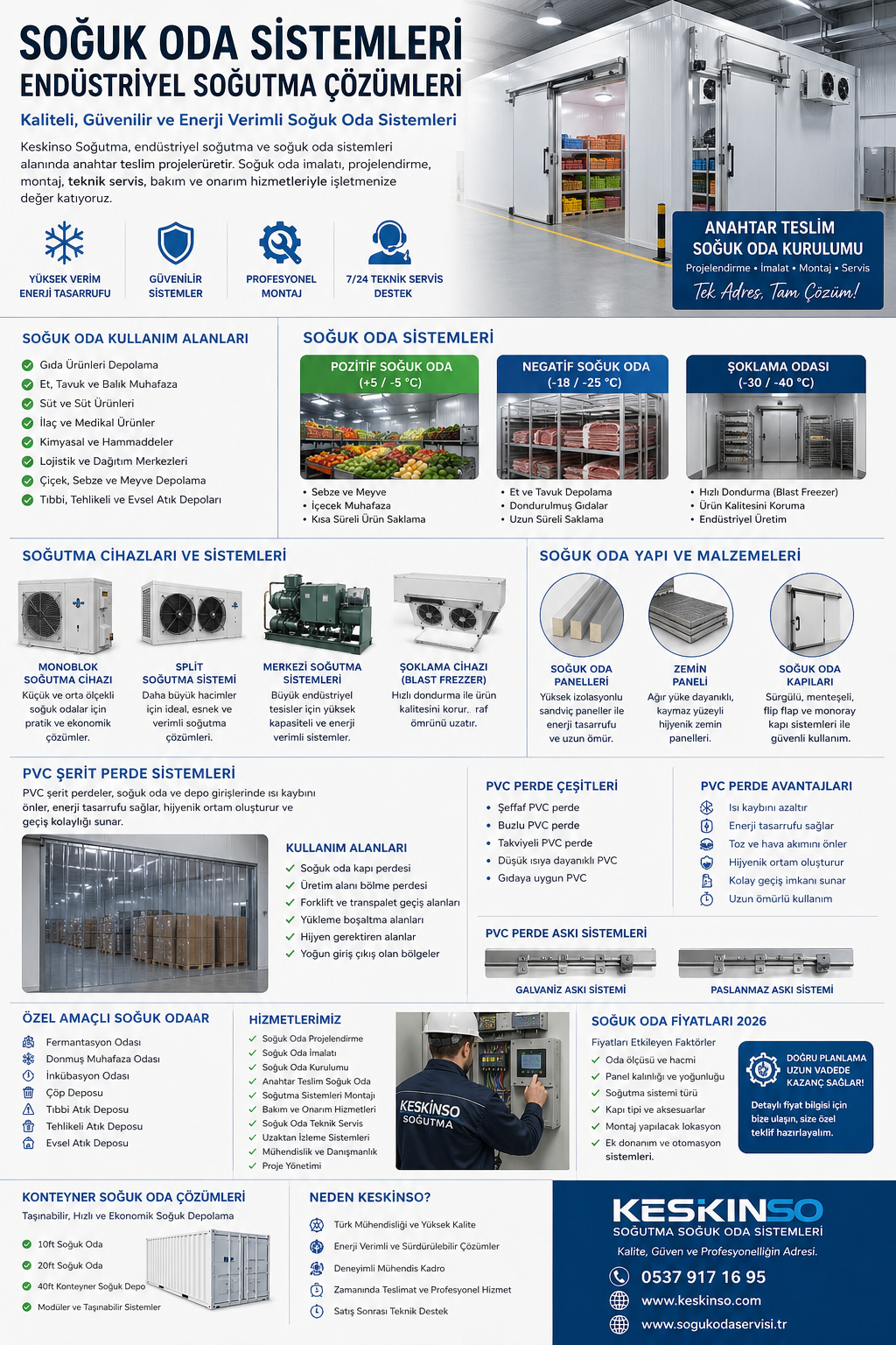 İşletmeniz için en doğru soğuk oda sistemleri, endüstriyel soğutma sistemleri ve enerji tasarruflu soğuk oda sistemleri çözümünü birlikte belirleyelim. Soğuk hava deposu fiyatları 2026 güncel liste ve PVC şerit perde fiyatları için bizi arayın.