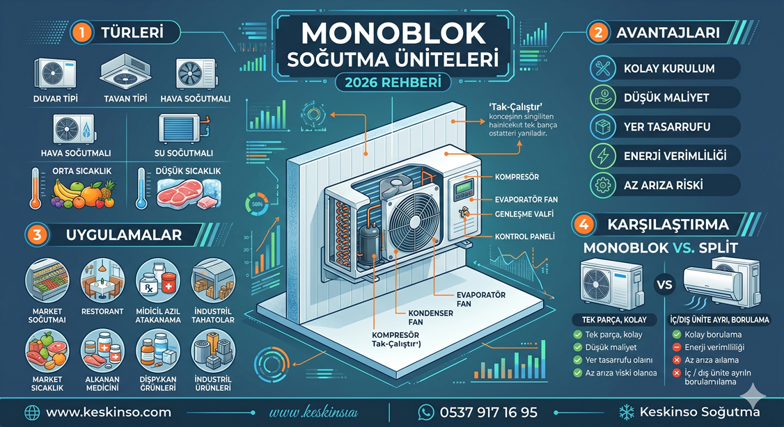 Monoblok soğutma ünitesi, kompresör, kondenser ve evaporatör (buharlaştırıcı) gibi tüm temel bileşenlerin tek bir gövde içinde birleştiği entegre soğutma sistemidir.