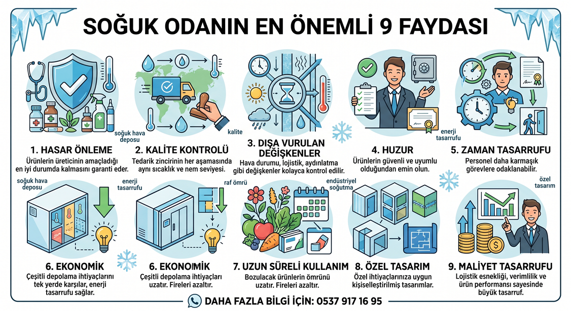 Bir soğuk oda olmadan, personel eşyaların güvenli ve etkili kullanımı için gereken hassas sıcaklık ve nem seviyelerinde tutulmasını sağlamak adına büyük miktarda zaman ve enerji harcamak zorunda kalacaktır. Mekanik olarak sıcaklık kontrollü ortamı koruyarak, personel soğuk depoya hızlıca girip çıkabilir. Özellikle anahtar teslim soğuk oda çözümleri sayesinde işletmeler altyapı dertleriyle uğraşmaz, zamanlarını doğrudan kendi operasyonlarına ve ticari hedeflerine odaklayabilirler.