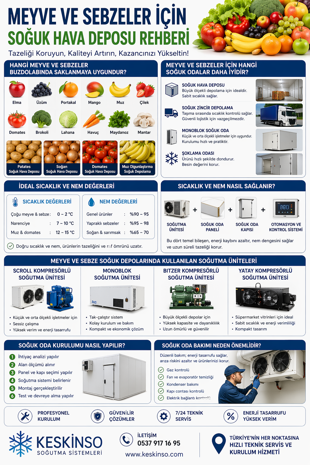 Gıda sektöründe kaliteyi korumanın en önemli yolu doğru depolamadır. Özellikle meyve ve sebze soğuk hava deposu sistemleri, ürünlerin tazeliğini, besin değerini ve raf ömrünü doğrudan etkiler. Bu rehberde; hangi ürünlerin nasıl saklanması gerektiğinden, doğru soğuk oda kurulumu, sıcaklık ve nem değerlerine kadar tüm detayları bulacaksınız.