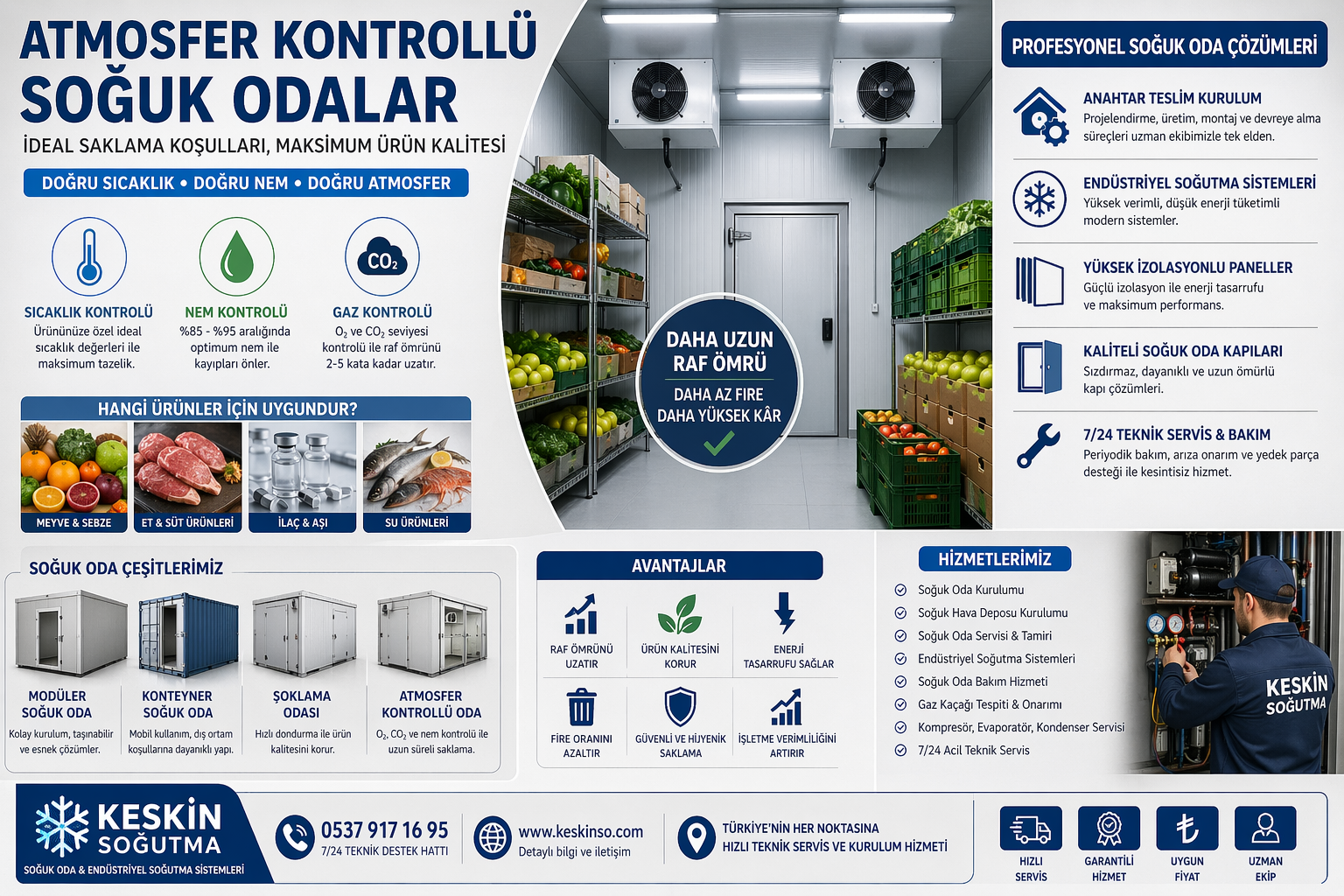 Gıda, ilaç ve hassas ürünlerin uzun süre bozulmadan saklanabilmesi için geliştirilen en ileri teknolojilerden biri atmosfer kontrollü soğuk oda sistemleridir. Günümüzde soğuk oda, soğuk depo ve soğuk hava deposu çözümleri arasında en verimli sonuçları veren bu sistemler, özellikle meyve, sebze, et ve süt ürünleri için vazgeçilmez hale gelmiştir.